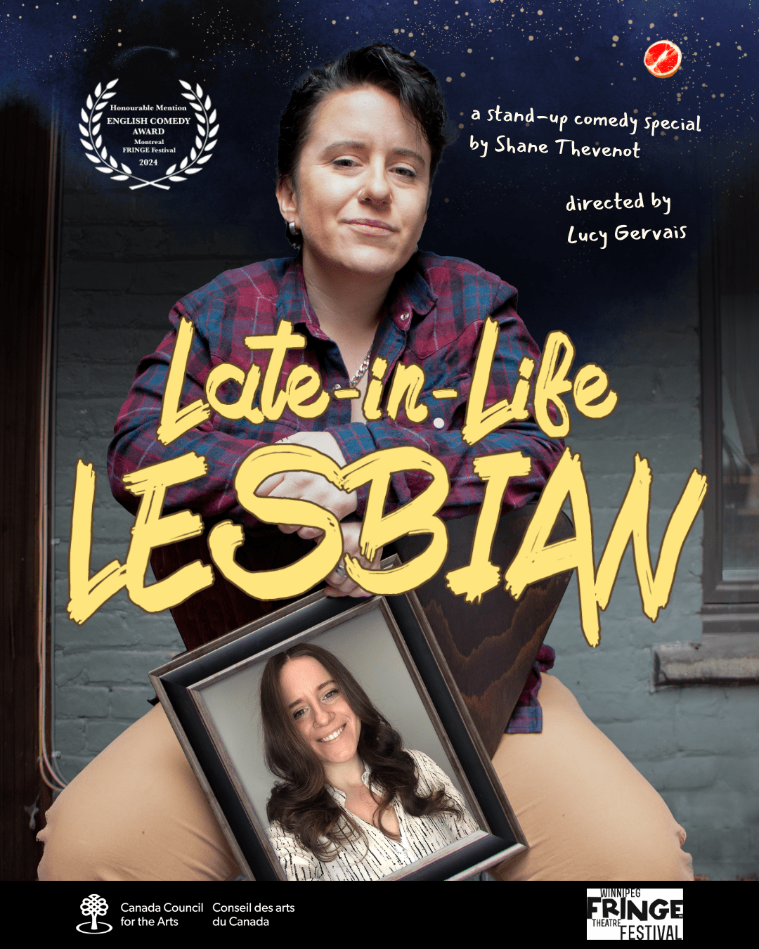 Late-in-Life Lesbian is the award-nominated, breakout solo show of Winnipeg comedian, Shane Thevenot. It is a heart-warming autobiographical coming-out story of a non-binary lesbian who gave up everything to live their best gay life.